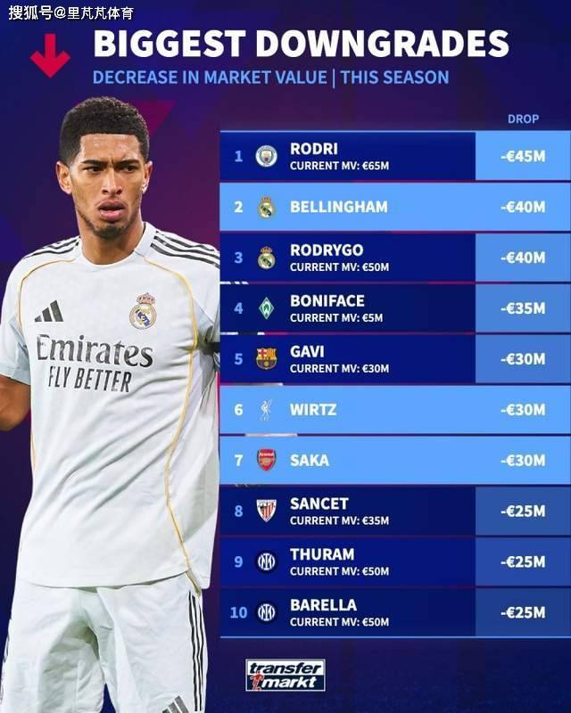 德转盘点了本赛季目前球员身价下跌榜,其中罗德里下降4500万欧最多,贝林、罗德里戈下降4000万欧。